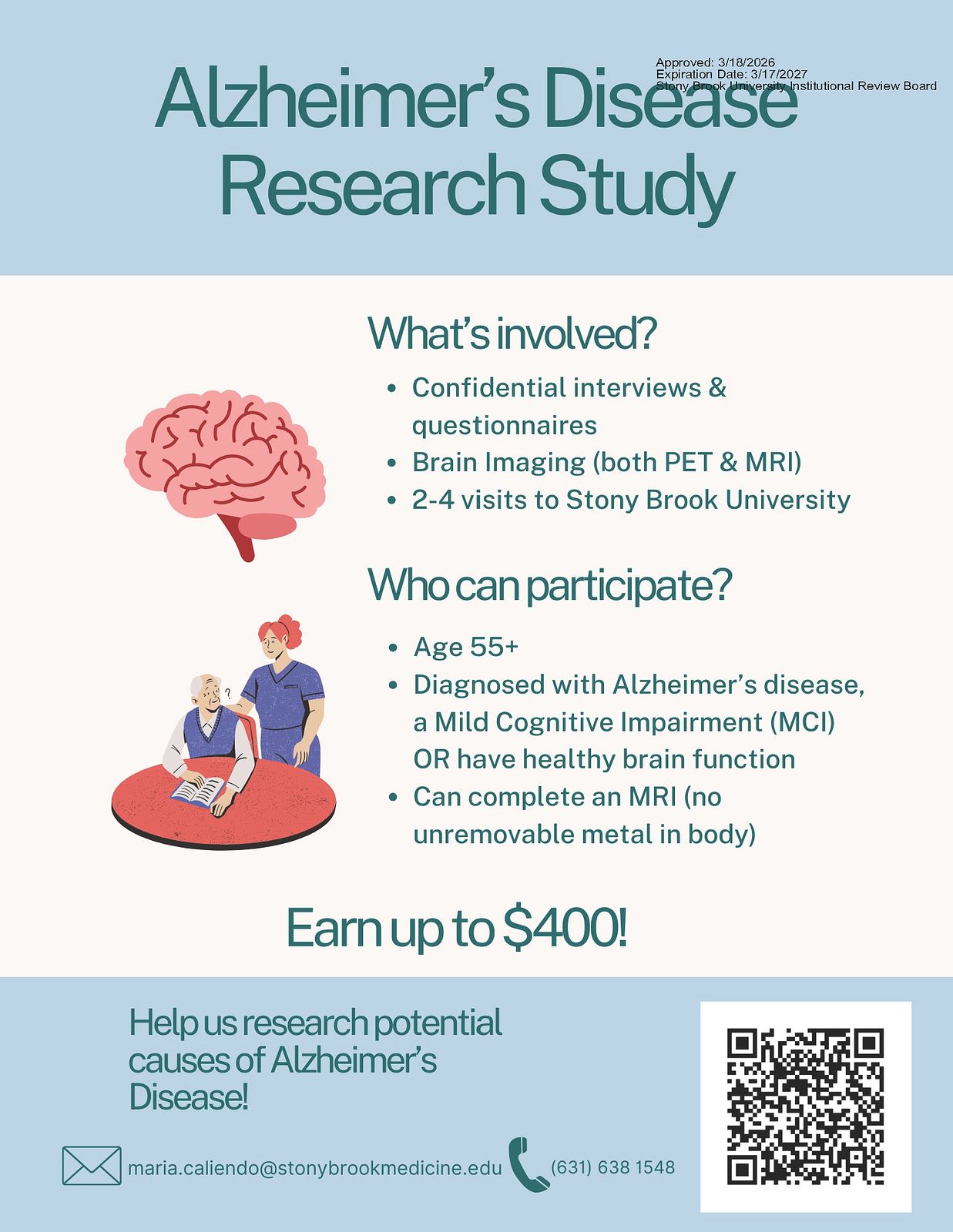 We are looking for volunteers ages 55 or older to participate in research studies to better understand memory impairment and Alzheimer’s disease. Volunteers who speak English fluently, either with or without memory problems, are eligible for the study. The study involves brief testing for memory and cognition and blood draw, with the total time commitment will be about two hours. Compensation is up to $60 for completing all study procedures. To learn more about our research, please contact Maria Caliendo at (631) 638 1548 or [email protected].